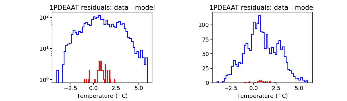 Note: 1PDEAAT residual histograms include only points where 1PDEAAT >= 30.0 C in blue and points where 1PDEAAT >= 40.0 C in red.
