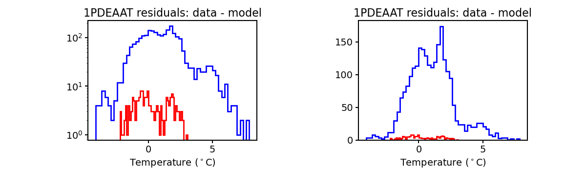 Note: 1PDEAAT residual histograms include only points where 1PDEAAT >= 30.0 C in blue and points where 1PDEAAT >= 40.0 C in red.
