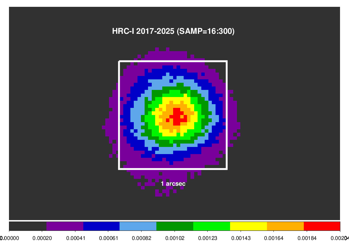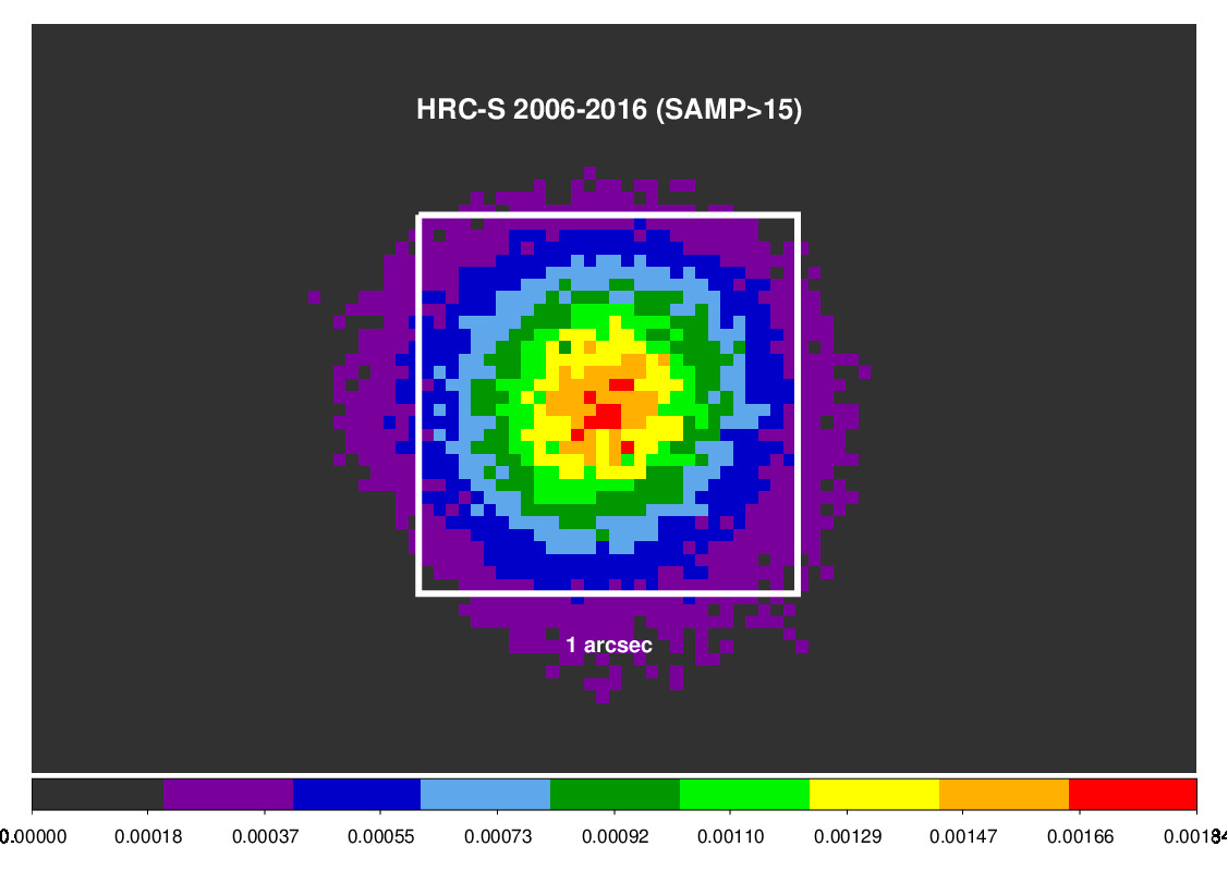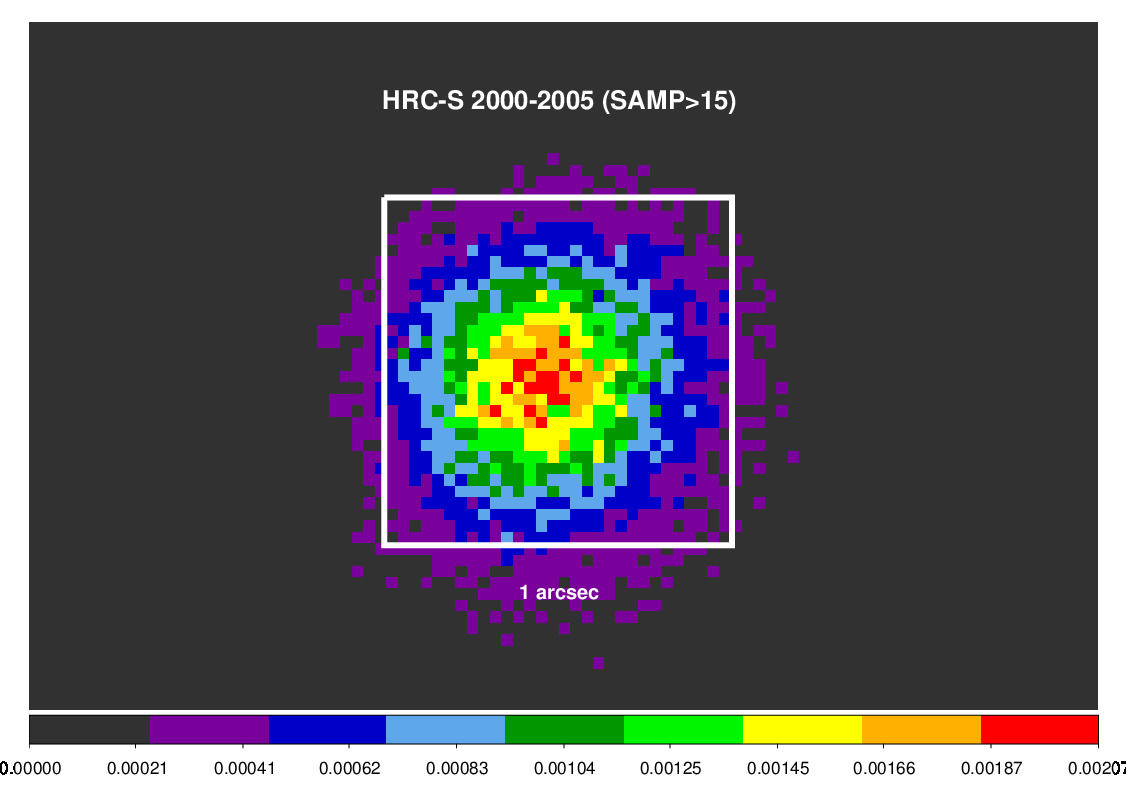 Filtered on status bits and GTI, excluding tailgated events and SAMP greater than 300; selected to be within 0.5 arcmin of the aimpoint and within 0.02 mm of the best focus for observations during the specified epoch; recentered, derolled, stacked, binned at 1/4 HRC pixel, background subtracted, and normalized to sum to 1.