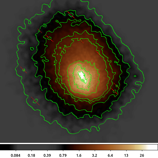As this example shows, there are several small regions that are excluded from within the main contour; as well as several other smaller contour regions outside the primary emission. The dmcontour output is a FITS region composed of polygons; the regions are constructed such that the pixel values greater than the contour level are included in the polygon.