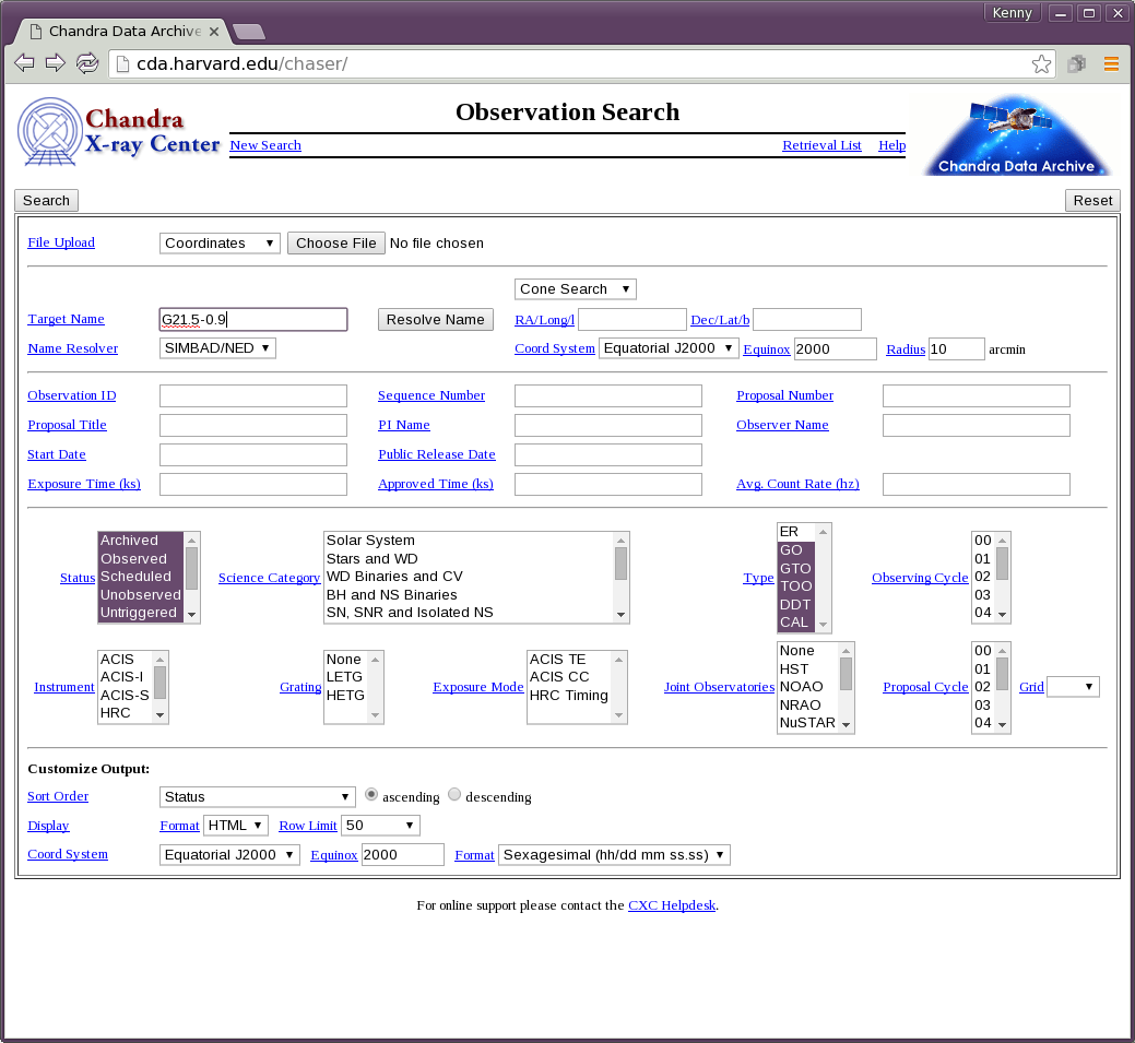 - Figure 1: The completed ChaSeR form to search for ACIS-I observations of G21.5-0.9