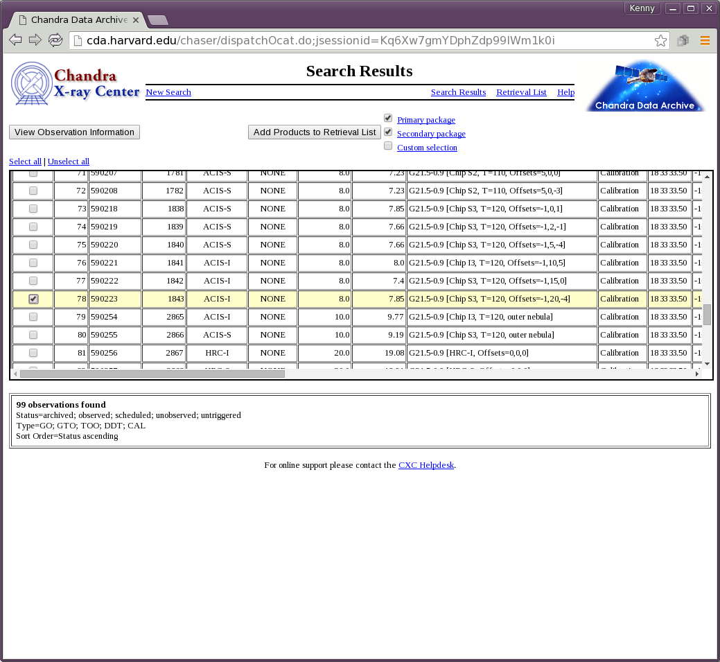 When you are ready to download the dataset, make sure the ObsID(s) are you interested in are checked off in the search results page. By default, both the primary and secondary products (Figure 3) in ChaSeR. Uncheck either option if you don't wish to download both. Users can also request a custom package that may include level 0 and level 1.5 data products not previously accessible via this interface.