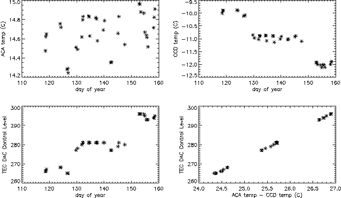 Also of interest are the pre- and post-cool temperatures of the ACA and the CCD, as well as the TEC set point. The plots below are constructed from monitor window data during the weeks immediately before and during the cooling process. No unexpected changes are evident.
