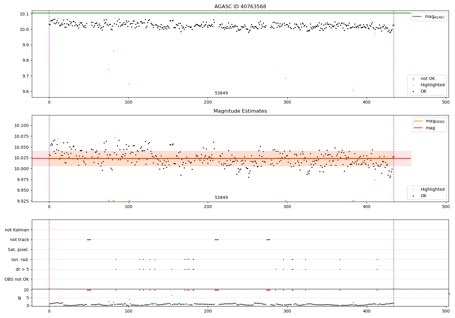 | OBSID | Time | Row | Col | N | Nok | Nout | ftrack | fdr3 | fdr5 | fok | ⟨ δ mag ⟩ 100s | ⟨ mag ⟩ | σmag | Comments |