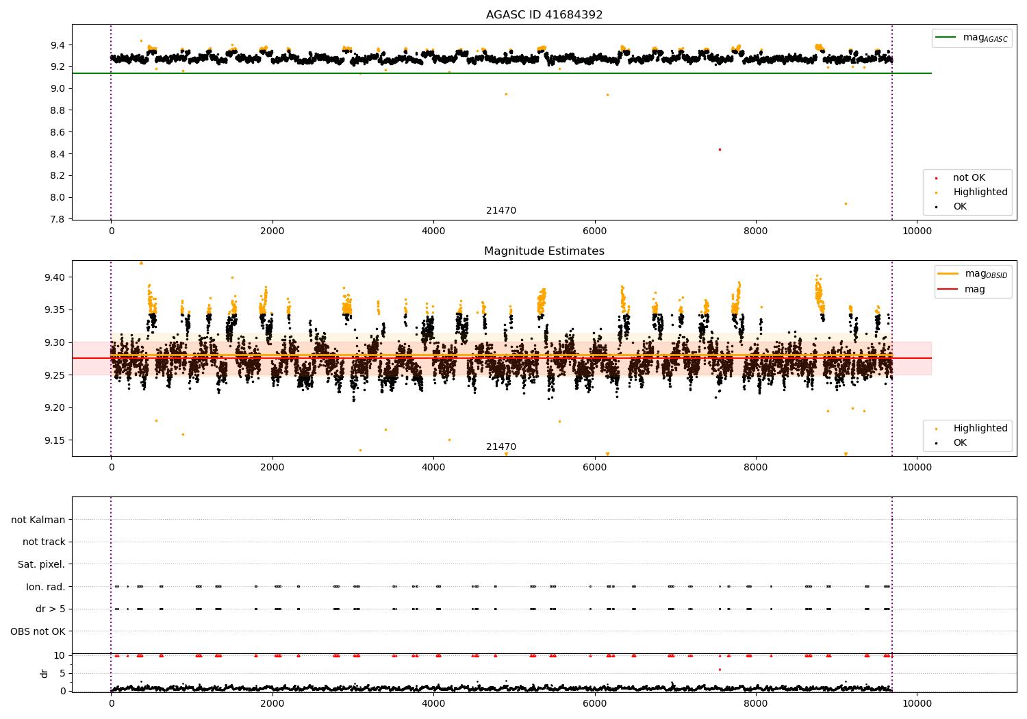 | OBSID | Time | Row | Col | N | Nok | Nout | ftrack | fdr3 | fdr5 | fok | ⟨ δ mag ⟩ 100s | ⟨ mag ⟩ | σmag | Comments |