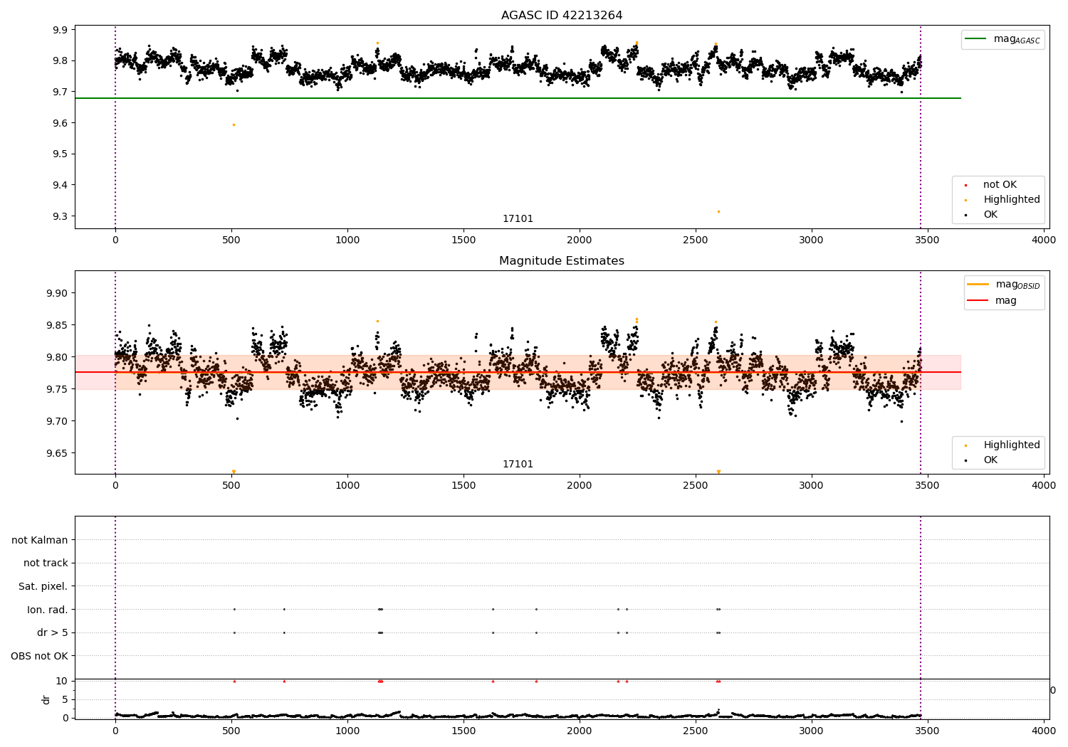 | OBSID | Time | Row | Col | N | Nok | Nout | ftrack | fdr3 | fdr5 | fok | ⟨ δ mag ⟩ 100s | ⟨ mag ⟩ | σmag | Comments |
