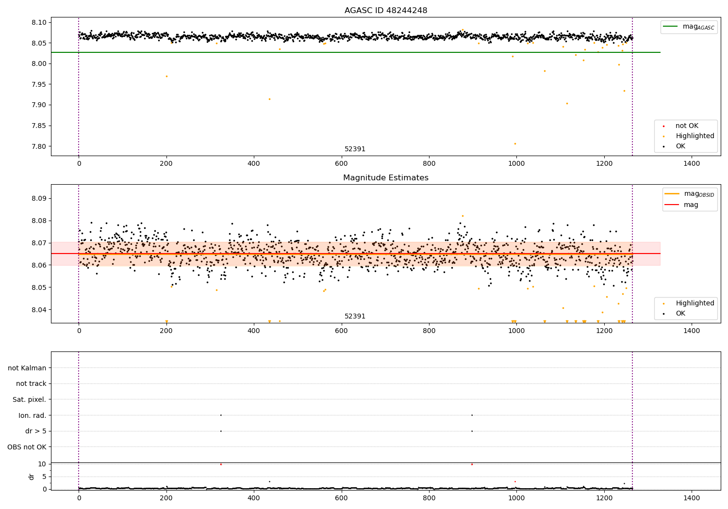 | OBSID | Time | Row | Col | N | Nok | Nout | ftrack | fdr3 | fdr5 | fok | ⟨ δ mag ⟩ 100s | ⟨ mag ⟩ | σmag | Comments |