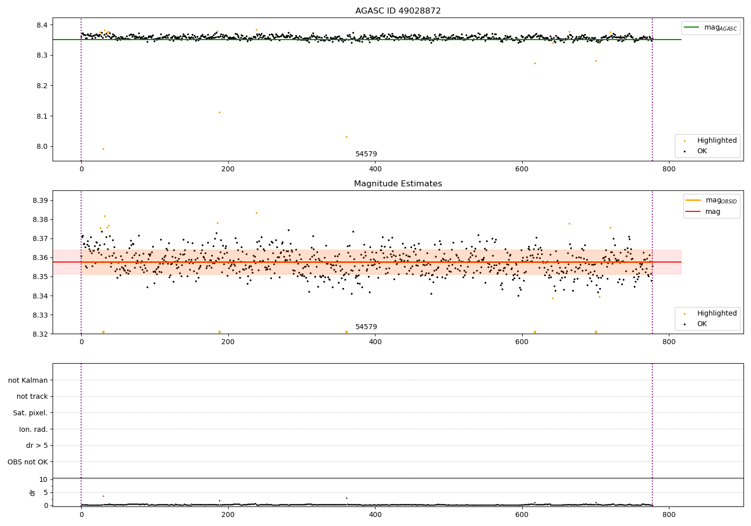 | OBSID | Time | Row | Col | N | Nok | Nout | ftrack | fdr3 | fdr5 | fok | ⟨ δ mag ⟩ 100s | ⟨ mag ⟩ | σmag | Comments |