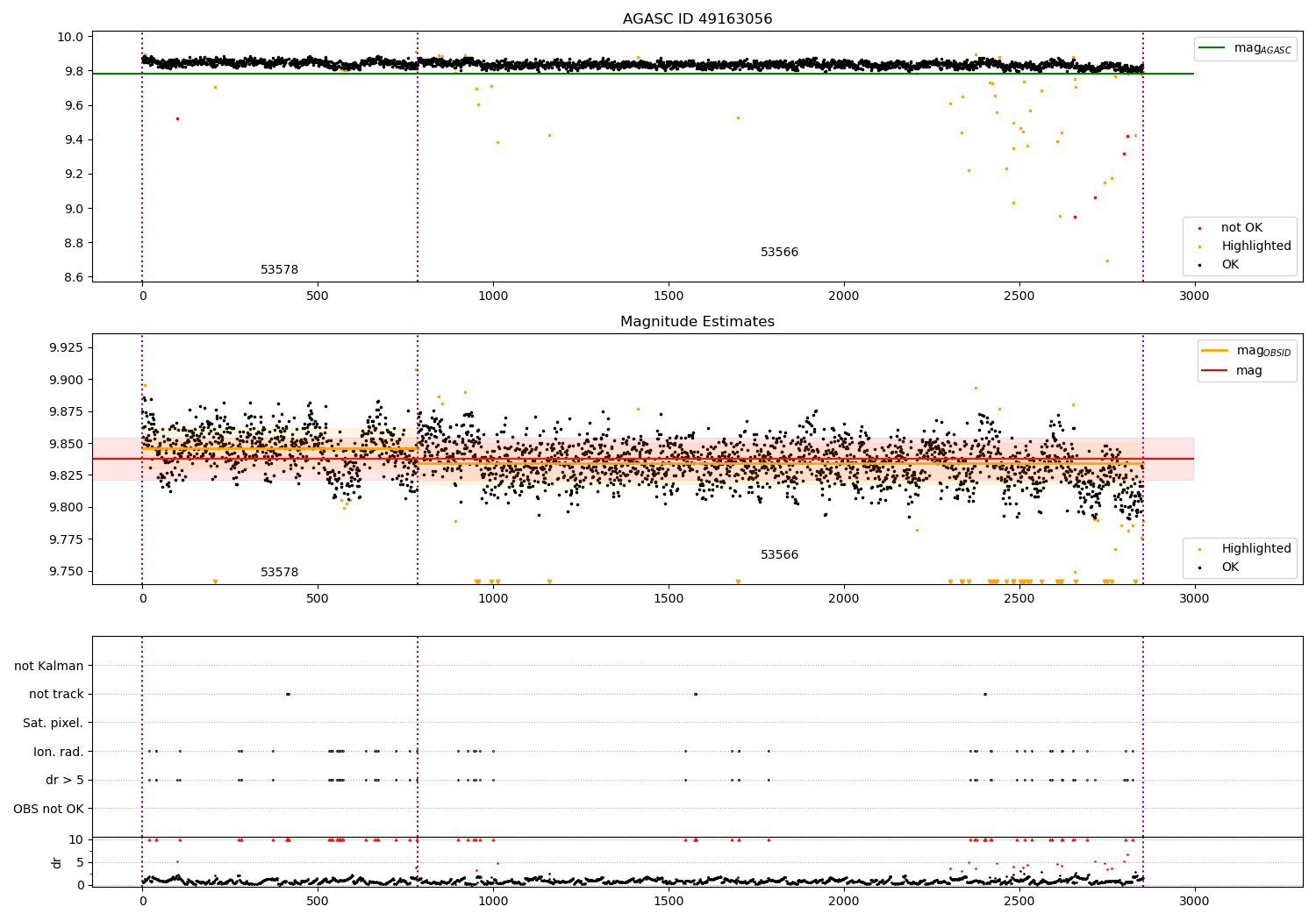 | OBSID | Time | Row | Col | N | Nok | Nout | ftrack | fdr3 | fdr5 | fok | ⟨ δ mag ⟩ 100s | ⟨ mag ⟩ | σmag | Comments |
