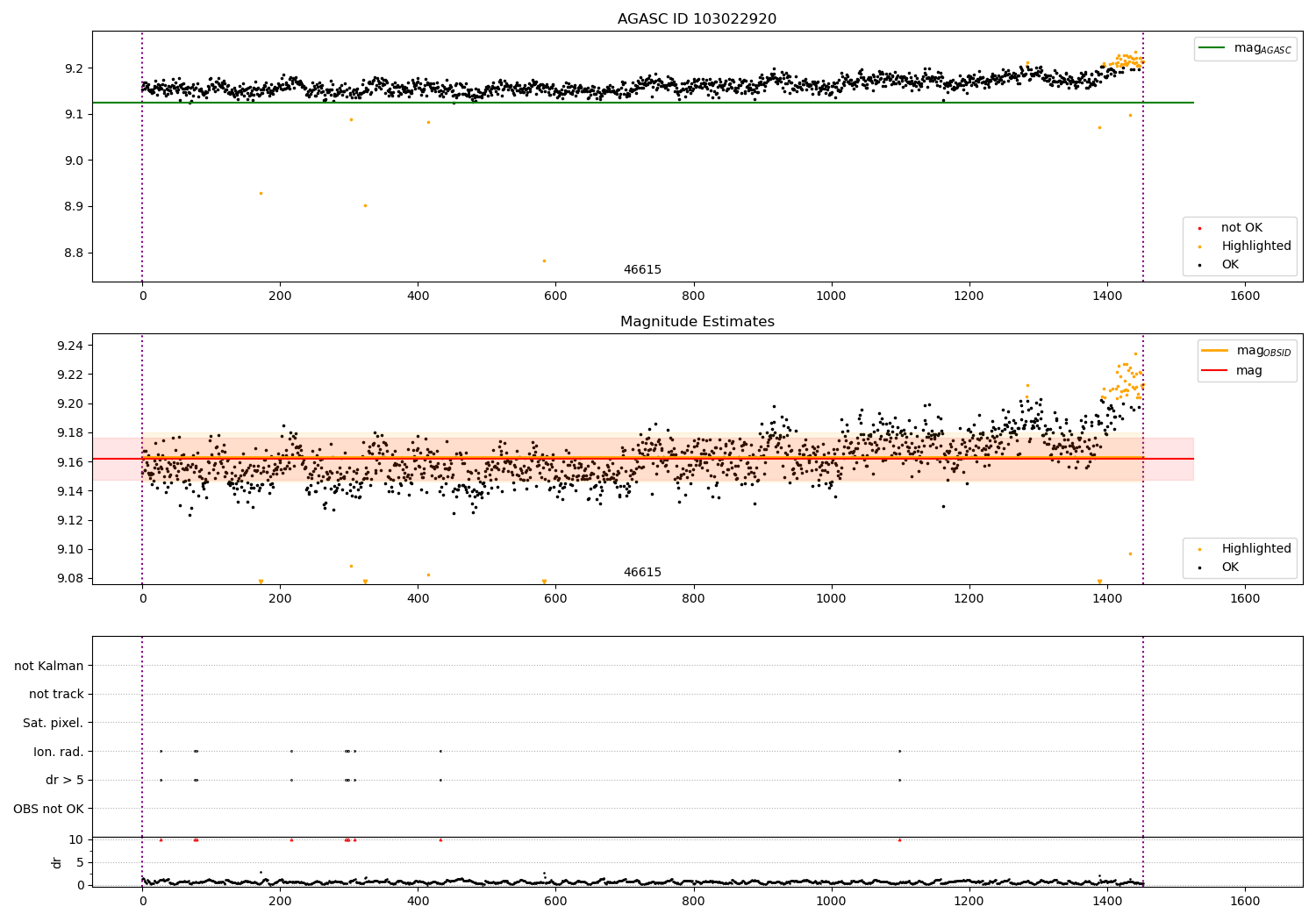 | OBSID | Time | Row | Col | N | Nok | Nout | ftrack | fdr3 | fdr5 | fok | ⟨ δ mag ⟩ 100s | ⟨ mag ⟩ | σmag | Comments |