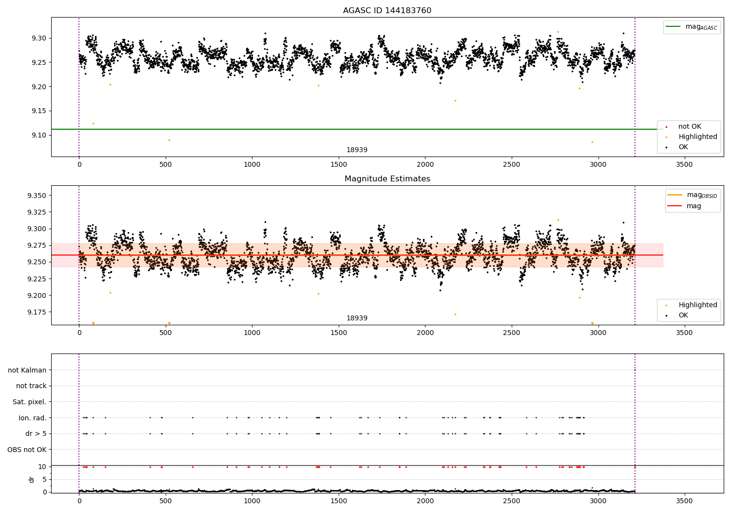 | OBSID | Time | Row | Col | N | Nok | Nout | ftrack | fdr3 | fdr5 | fok | ⟨ δ mag ⟩ 100s | ⟨ mag ⟩ | σmag | Comments |