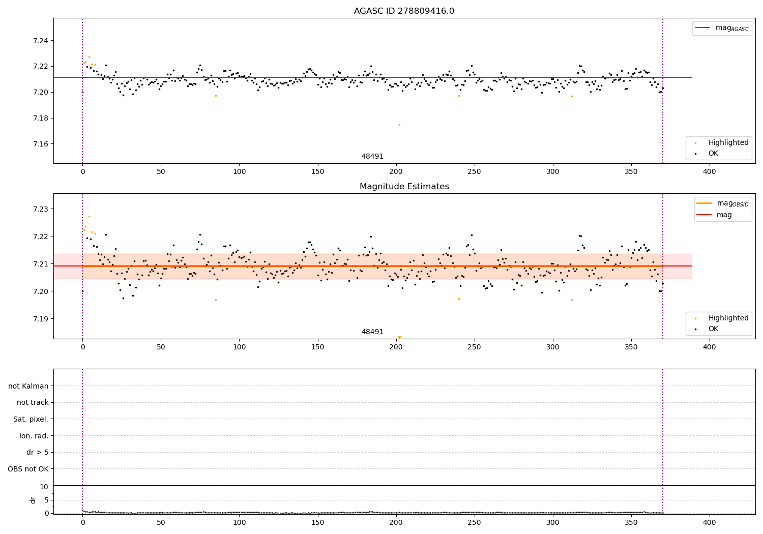 | OBSID | Time | Row | Col | N | Nok | Nout | ftrack | fdr3 | fdr5 | fok | ⟨ δ mag ⟩ 100s | ⟨ mag ⟩ | σmag | Comments |