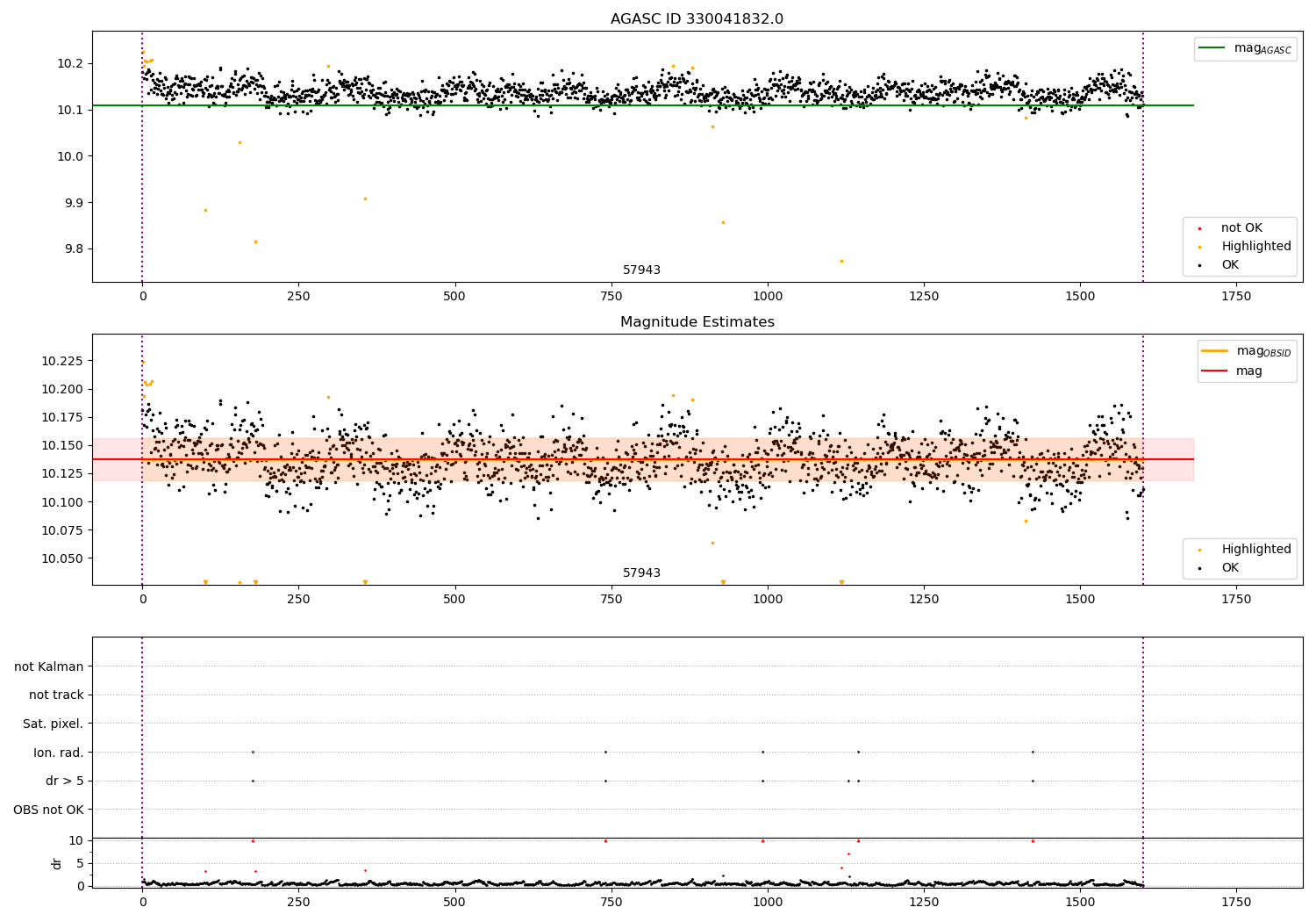 | OBSID | Time | Row | Col | N | Nok | Nout | ftrack | fdr3 | fdr5 | fok | ⟨ δ mag ⟩ 100s | ⟨ mag ⟩ | σmag | Comments |