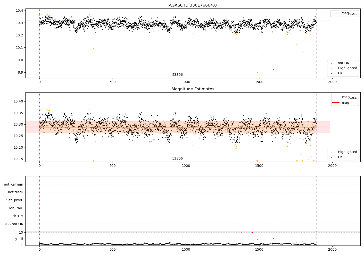 | OBSID | Time | Row | Col | N | Nok | Nout | ftrack | fdr3 | fdr5 | fok | ⟨ δ mag ⟩ 100s | ⟨ mag ⟩ | σmag | Comments |