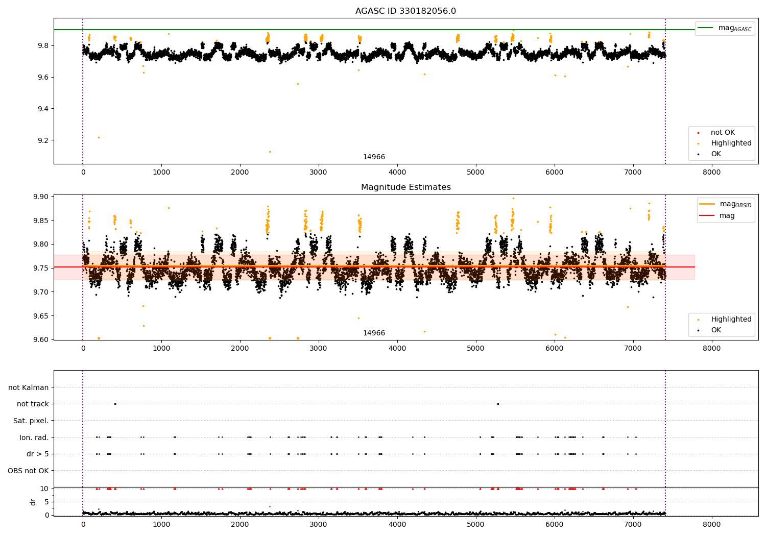 | OBSID | Time | Row | Col | N | Nok | Nout | ftrack | fdr3 | fdr5 | fok | ⟨ δ mag ⟩ 100s | ⟨ mag ⟩ | σmag | Comments |
