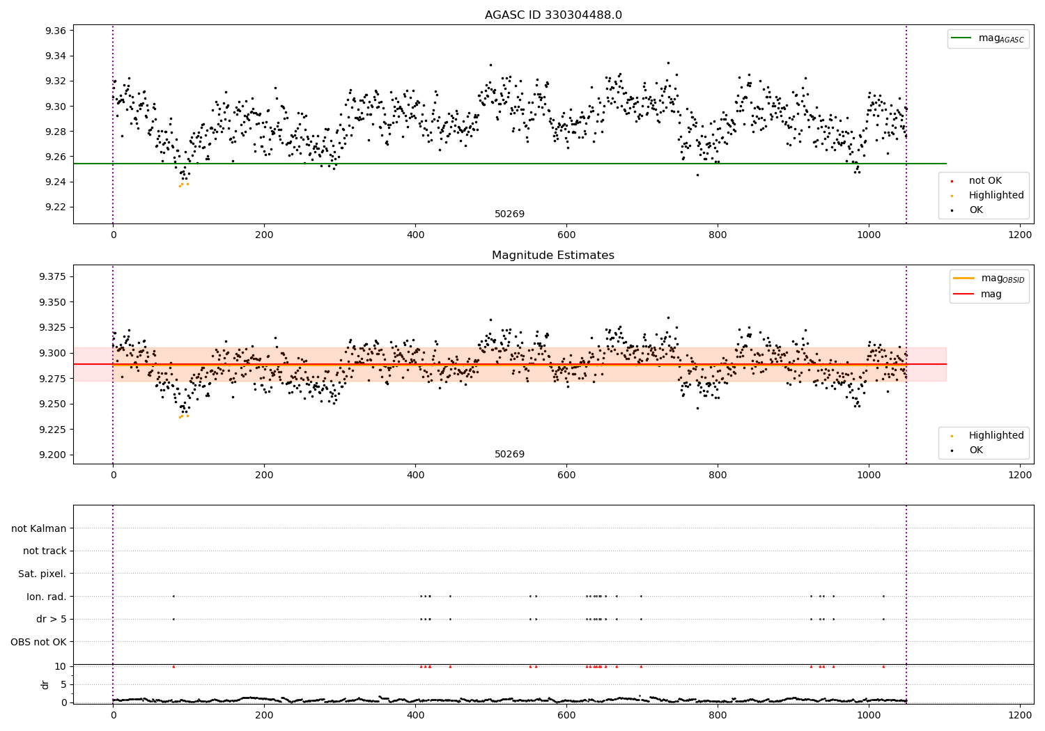 | OBSID | Time | Row | Col | N | Nok | Nout | ftrack | fdr3 | fdr5 | fok | ⟨ δ mag ⟩ 100s | ⟨ mag ⟩ | σmag | Comments |