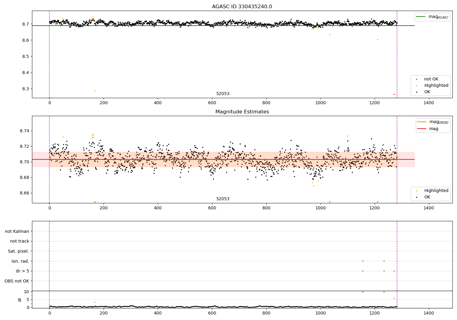 | OBSID | Time | Row | Col | N | Nok | Nout | ftrack | fdr3 | fdr5 | fok | ⟨ δ mag ⟩ 100s | ⟨ mag ⟩ | σmag | Comments |