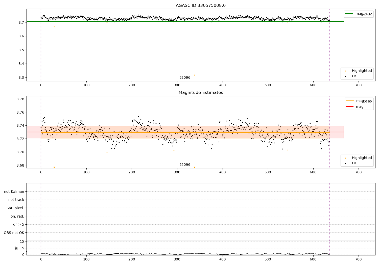 | OBSID | Time | Row | Col | N | Nok | Nout | ftrack | fdr3 | fdr5 | fok | ⟨ δ mag ⟩ 100s | ⟨ mag ⟩ | σmag | Comments |