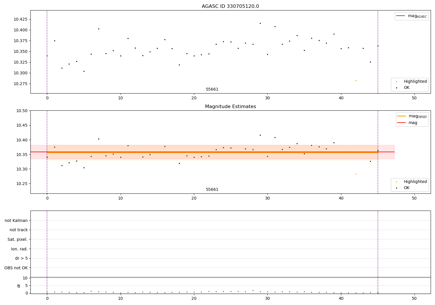 | OBSID | Time | Row | Col | N | Nok | Nout | ftrack | fdr3 | fdr5 | fok | ⟨ δ mag ⟩ 100s | ⟨ mag ⟩ | σmag | Comments |