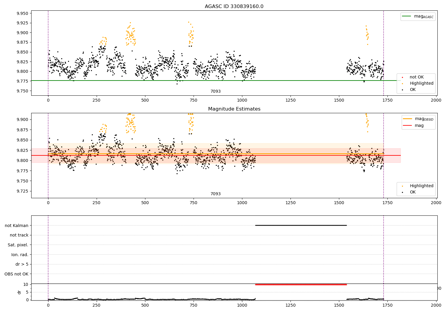 | OBSID | Time | Row | Col | N | Nok | Nout | ftrack | fdr3 | fdr5 | fok | ⟨ δ mag ⟩ 100s | ⟨ mag ⟩ | σmag | Comments |