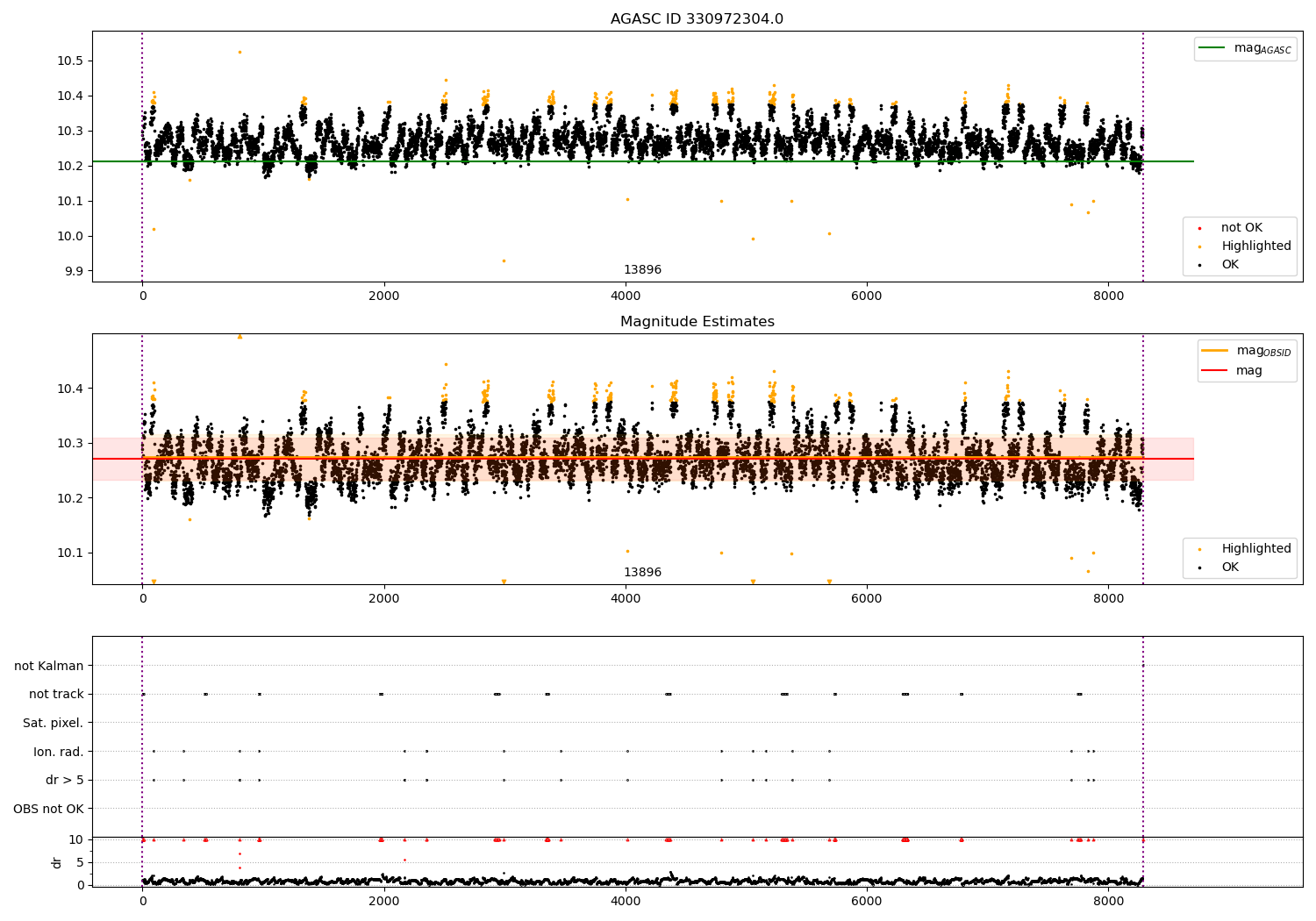 | OBSID | Time | Row | Col | N | Nok | Nout | ftrack | fdr3 | fdr5 | fok | ⟨ δ mag ⟩ 100s | ⟨ mag ⟩ | σmag | Comments |