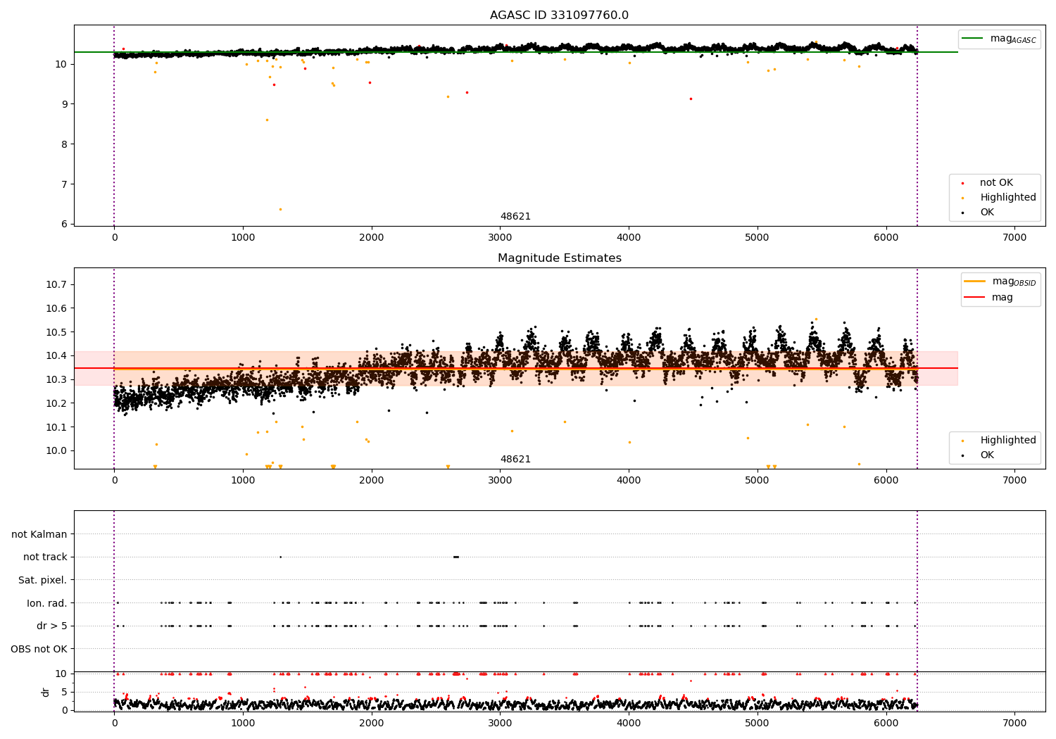 | OBSID | Time | Row | Col | N | Nok | Nout | ftrack | fdr3 | fdr5 | fok | ⟨ δ mag ⟩ 100s | ⟨ mag ⟩ | σmag | Comments |