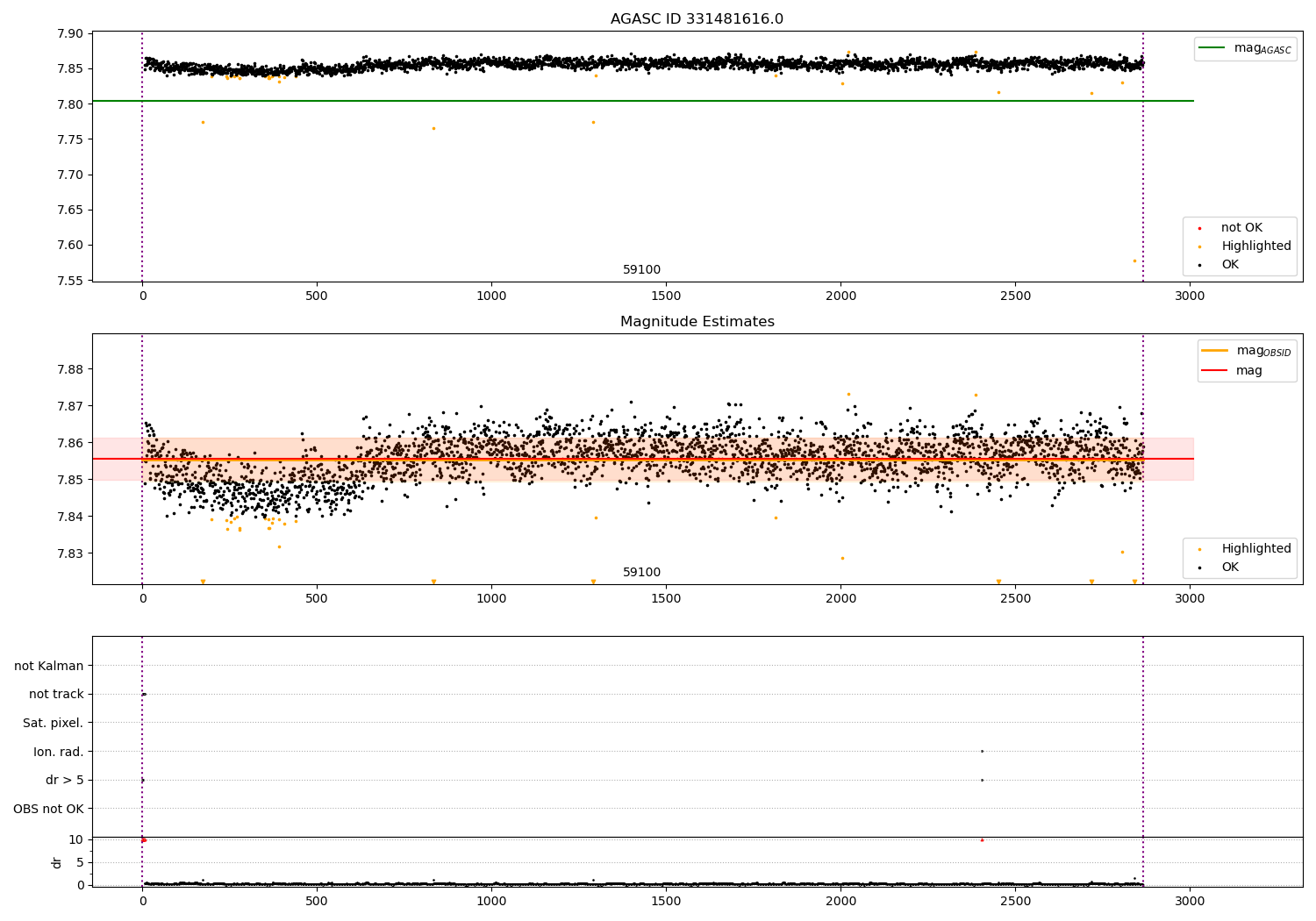 | OBSID | Time | Row | Col | N | Nok | Nout | ftrack | fdr3 | fdr5 | fok | ⟨ δ mag ⟩ 100s | ⟨ mag ⟩ | σmag | Comments |