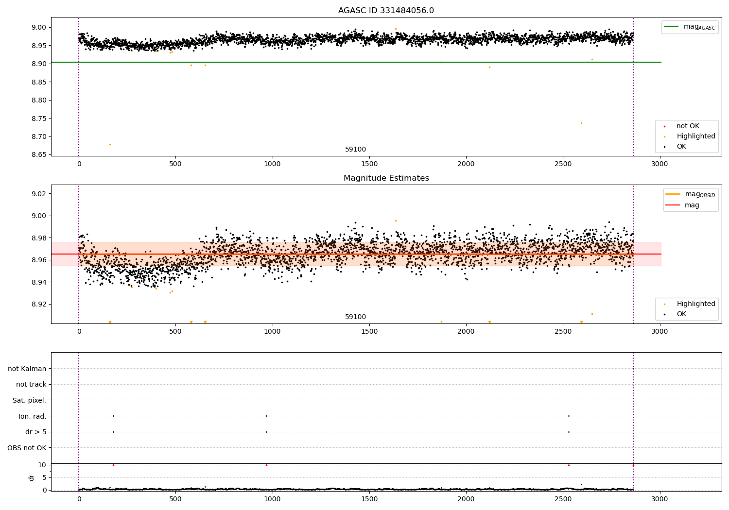 | OBSID | Time | Row | Col | N | Nok | Nout | ftrack | fdr3 | fdr5 | fok | ⟨ δ mag ⟩ 100s | ⟨ mag ⟩ | σmag | Comments |