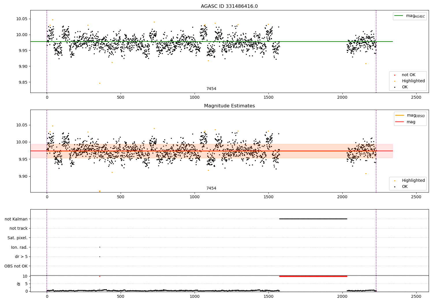 | OBSID | Time | Row | Col | N | Nok | Nout | ftrack | fdr3 | fdr5 | fok | ⟨ δ mag ⟩ 100s | ⟨ mag ⟩ | σmag | Comments |