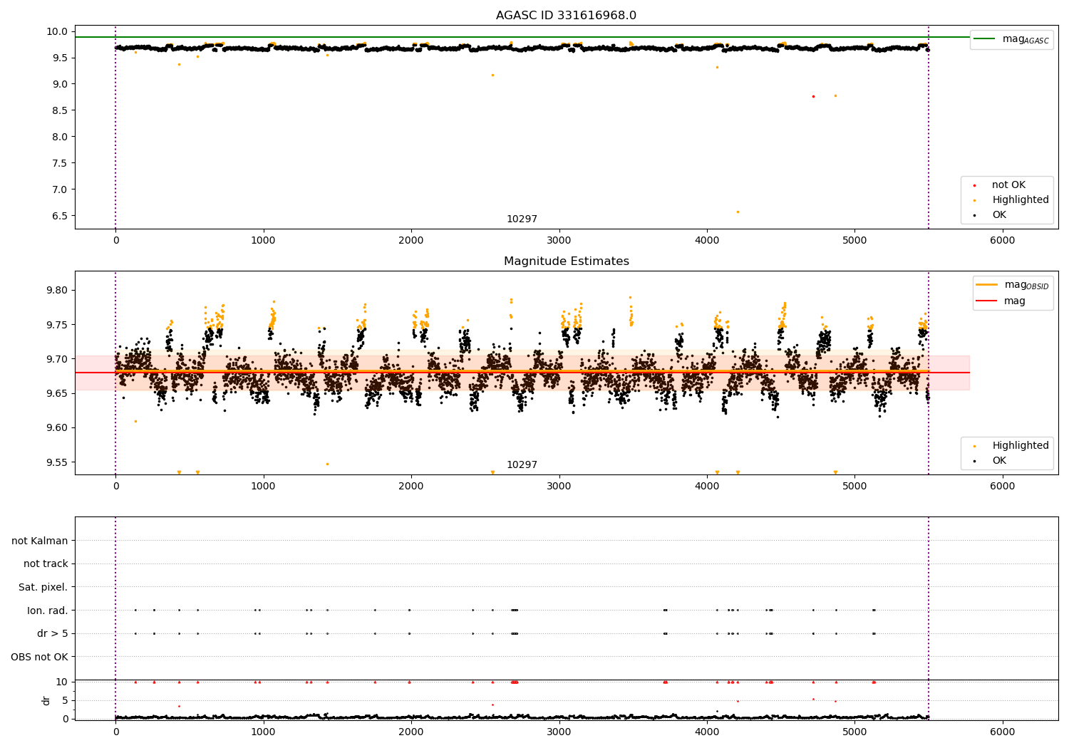| OBSID | Time | Row | Col | N | Nok | Nout | ftrack | fdr3 | fdr5 | fok | ⟨ δ mag ⟩ 100s | ⟨ mag ⟩ | σmag | Comments |