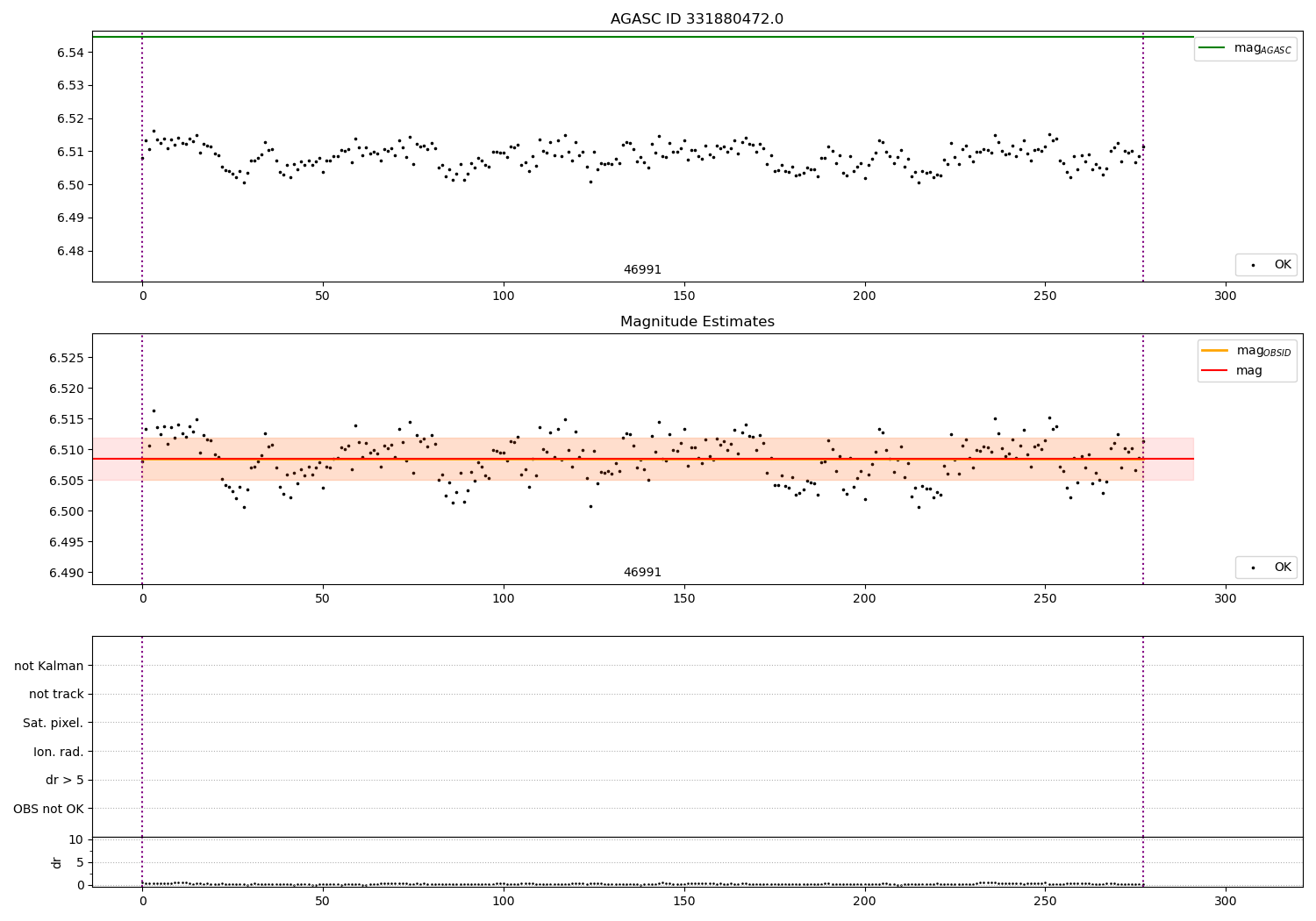 | OBSID | Time | Row | Col | N | Nok | Nout | ftrack | fdr3 | fdr5 | fok | ⟨ δ mag ⟩ 100s | ⟨ mag ⟩ | σmag | Comments |