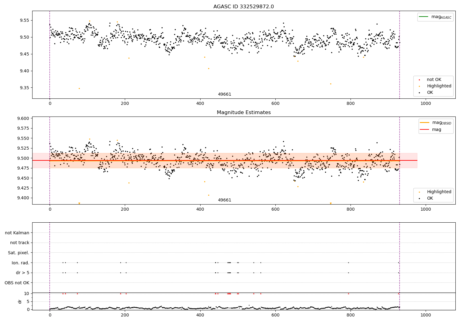 | OBSID | Time | Row | Col | N | Nok | Nout | ftrack | fdr3 | fdr5 | fok | ⟨ δ mag ⟩ 100s | ⟨ mag ⟩ | σmag | Comments |