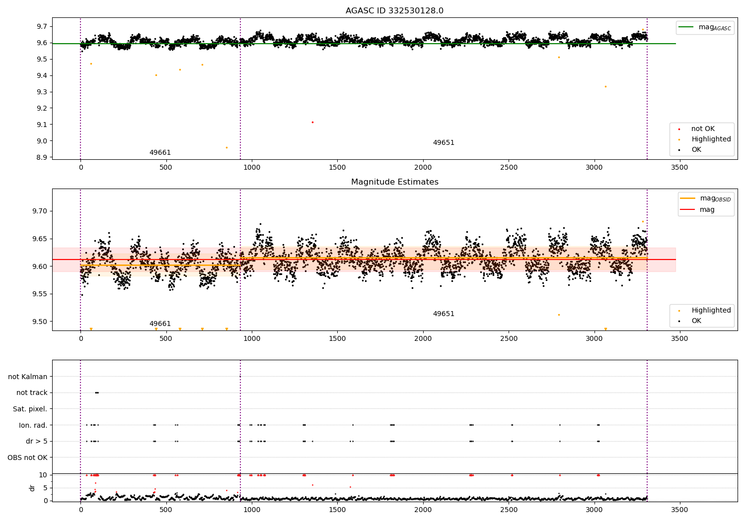 | OBSID | Time | Row | Col | N | Nok | Nout | ftrack | fdr3 | fdr5 | fok | ⟨ δ mag ⟩ 100s | ⟨ mag ⟩ | σmag | Comments |