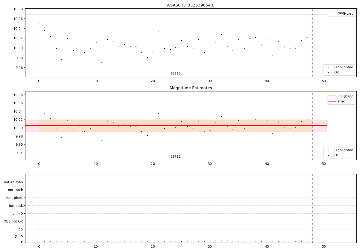 | OBSID | Time | Row | Col | N | Nok | Nout | ftrack | fdr3 | fdr5 | fok | ⟨ δ mag ⟩ 100s | ⟨ mag ⟩ | σmag | Comments |