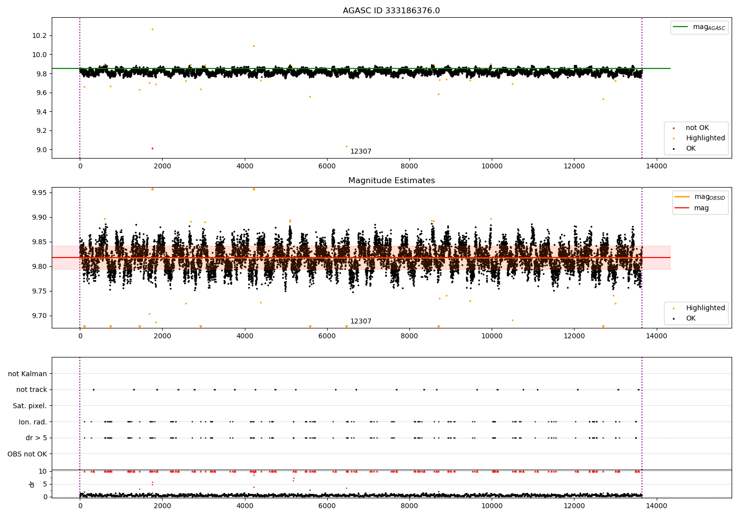 | OBSID | Time | Row | Col | N | Nok | Nout | ftrack | fdr3 | fdr5 | fok | ⟨ δ mag ⟩ 100s | ⟨ mag ⟩ | σmag | Comments |