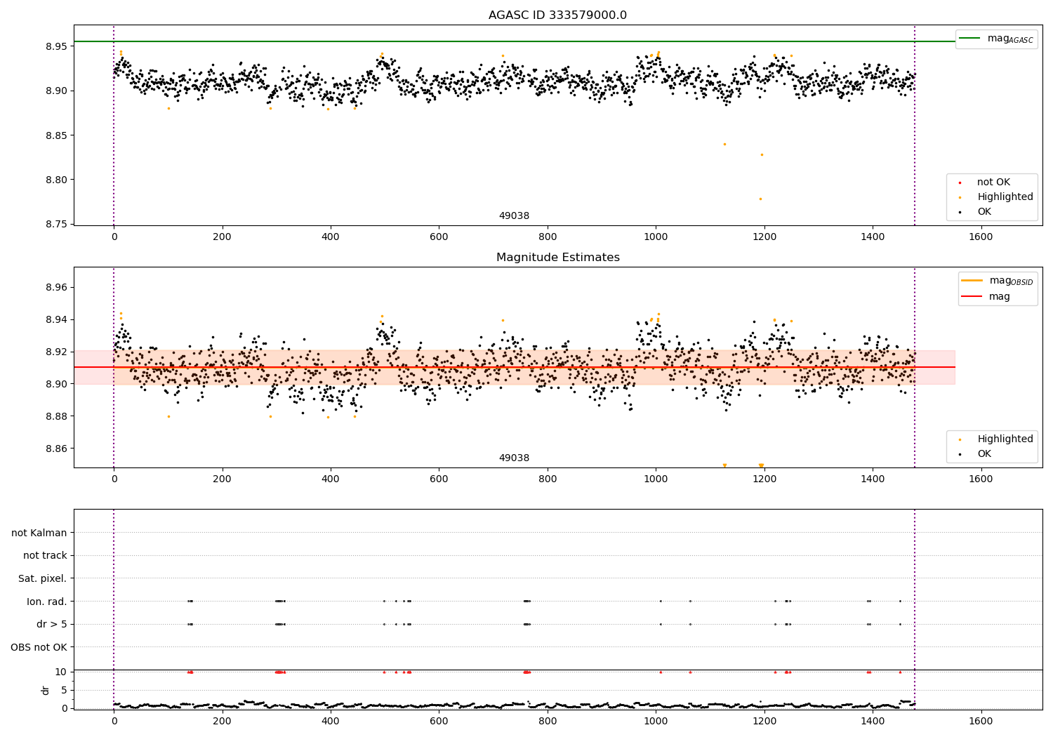| OBSID | Time | Row | Col | N | Nok | Nout | ftrack | fdr3 | fdr5 | fok | ⟨ δ mag ⟩ 100s | ⟨ mag ⟩ | σmag | Comments |