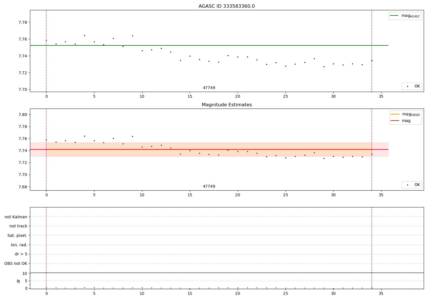 | OBSID | Time | Row | Col | N | Nok | Nout | ftrack | fdr3 | fdr5 | fok | ⟨ δ mag ⟩ 100s | ⟨ mag ⟩ | σmag | Comments |