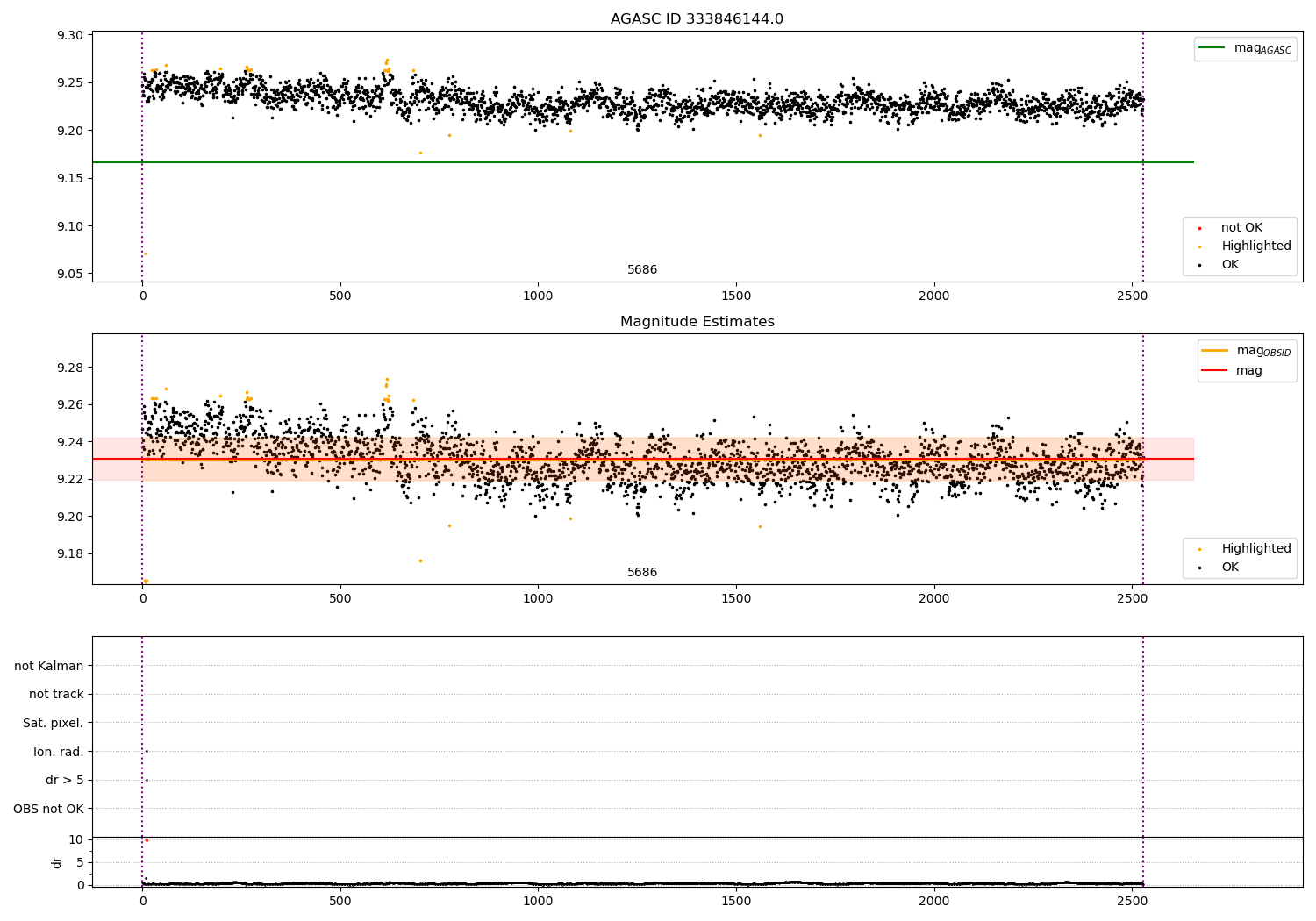 | OBSID | Time | Row | Col | N | Nok | Nout | ftrack | fdr3 | fdr5 | fok | ⟨ δ mag ⟩ 100s | ⟨ mag ⟩ | σmag | Comments |