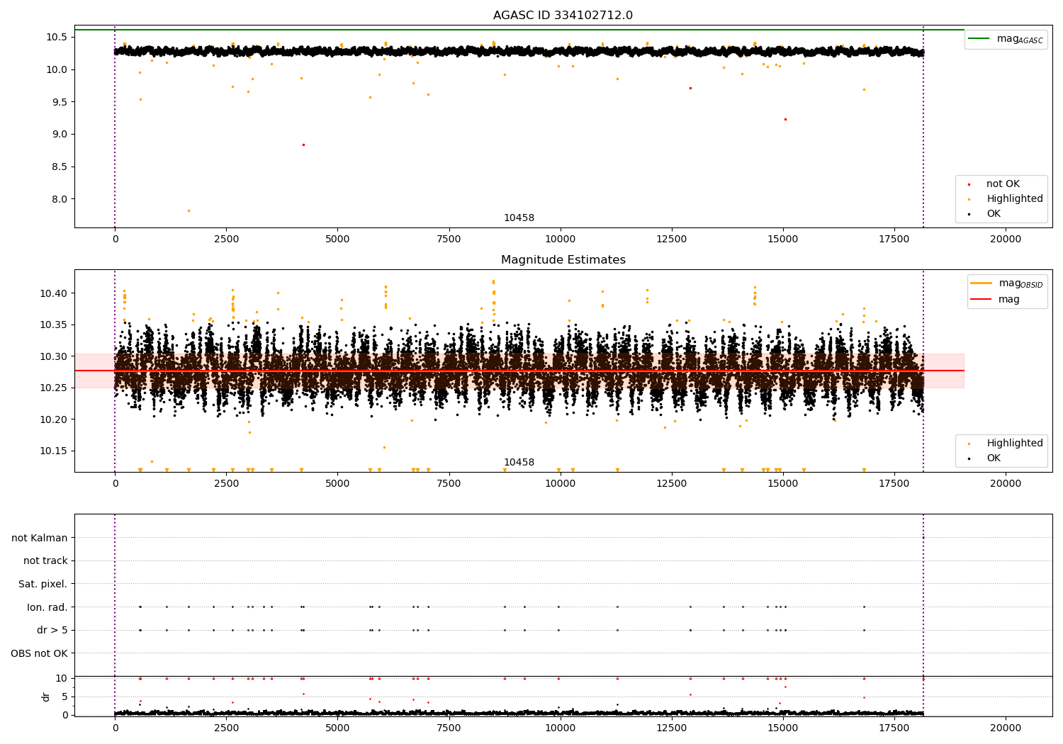 | OBSID | Time | Row | Col | N | Nok | Nout | ftrack | fdr3 | fdr5 | fok | ⟨ δ mag ⟩ 100s | ⟨ mag ⟩ | σmag | Comments |
