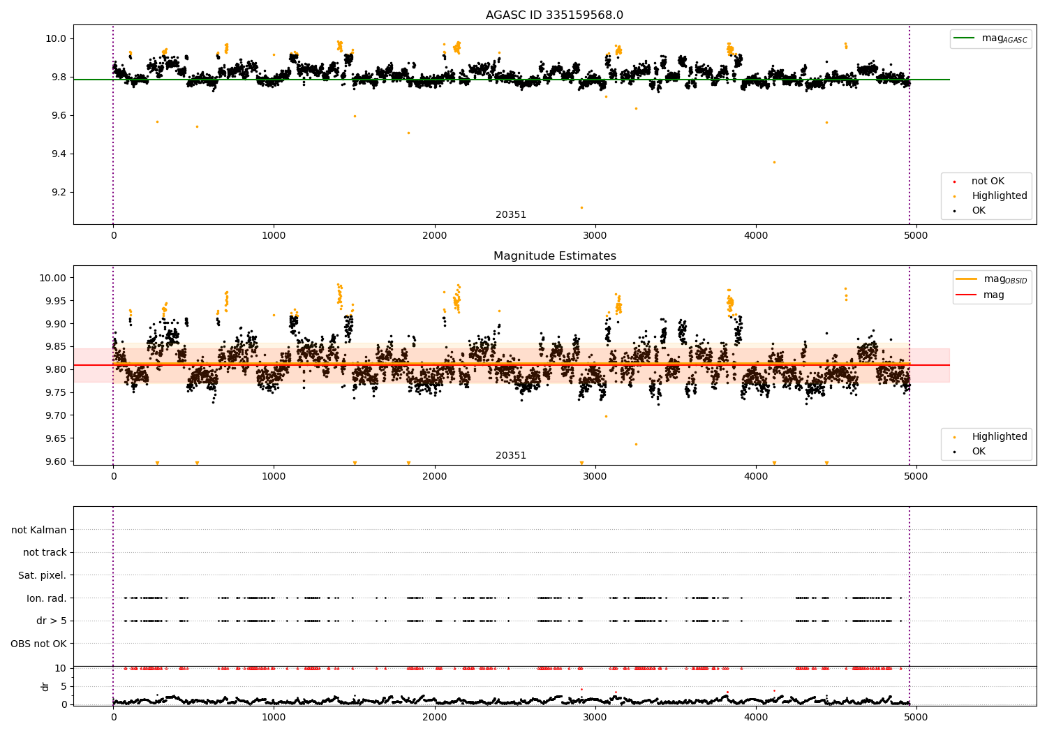 | OBSID | Time | Row | Col | N | Nok | Nout | ftrack | fdr3 | fdr5 | fok | ⟨ δ mag ⟩ 100s | ⟨ mag ⟩ | σmag | Comments |