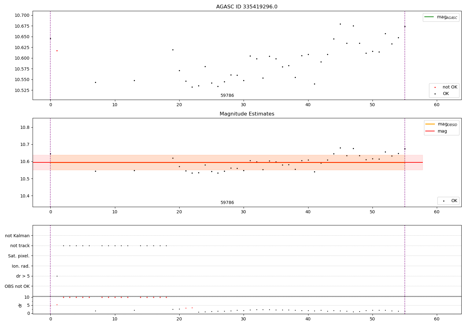 | OBSID | Time | Row | Col | N | Nok | Nout | ftrack | fdr3 | fdr5 | fok | ⟨ δ mag ⟩ 100s | ⟨ mag ⟩ | σmag | Comments |