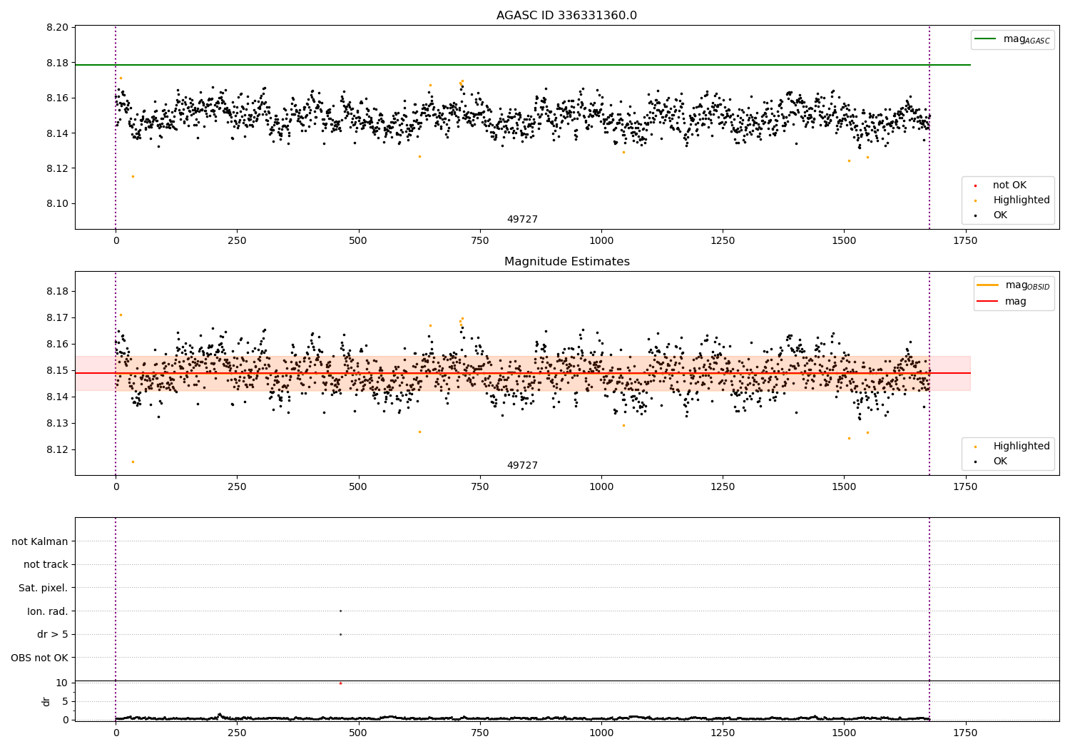 | OBSID | Time | Row | Col | N | Nok | Nout | ftrack | fdr3 | fdr5 | fok | ⟨ δ mag ⟩ 100s | ⟨ mag ⟩ | σmag | Comments |