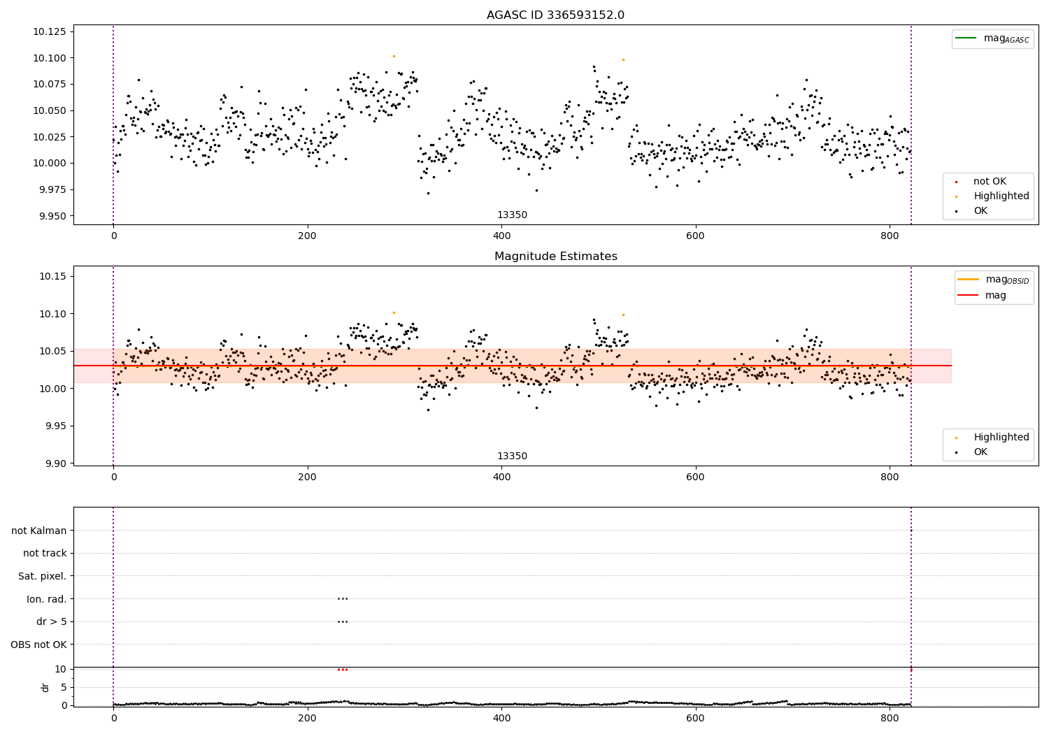 | OBSID | Time | Row | Col | N | Nok | Nout | ftrack | fdr3 | fdr5 | fok | ⟨ δ mag ⟩ 100s | ⟨ mag ⟩ | σmag | Comments |