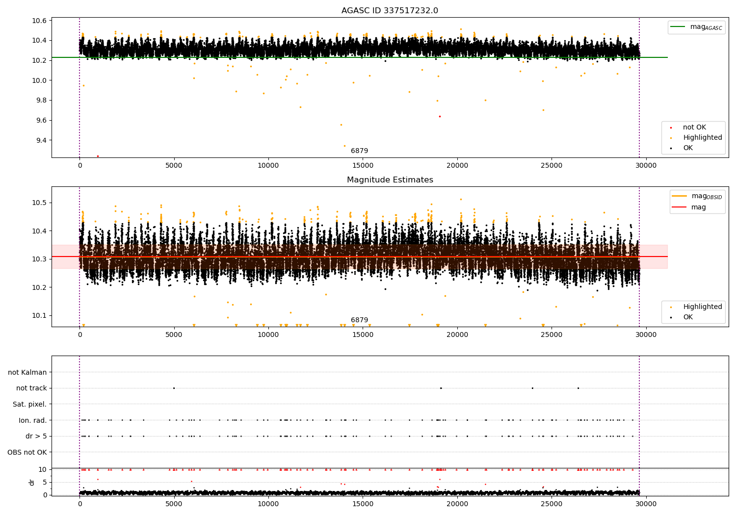| OBSID | Time | Row | Col | N | Nok | Nout | ftrack | fdr3 | fdr5 | fok | ⟨ δ mag ⟩ 100s | ⟨ mag ⟩ | σmag | Comments |