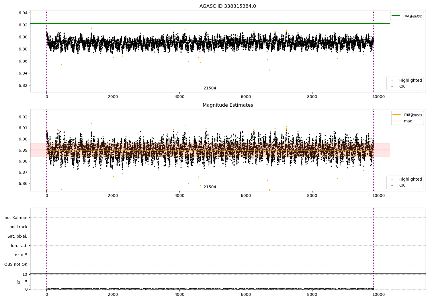 | OBSID | Time | Row | Col | N | Nok | Nout | ftrack | fdr3 | fdr5 | fok | ⟨ δ mag ⟩ 100s | ⟨ mag ⟩ | σmag | Comments |