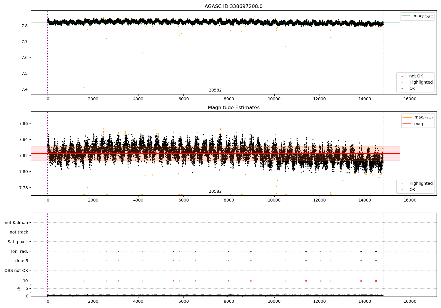 | OBSID | Time | Row | Col | N | Nok | Nout | ftrack | fdr3 | fdr5 | fok | ⟨ δ mag ⟩ 100s | ⟨ mag ⟩ | σmag | Comments |