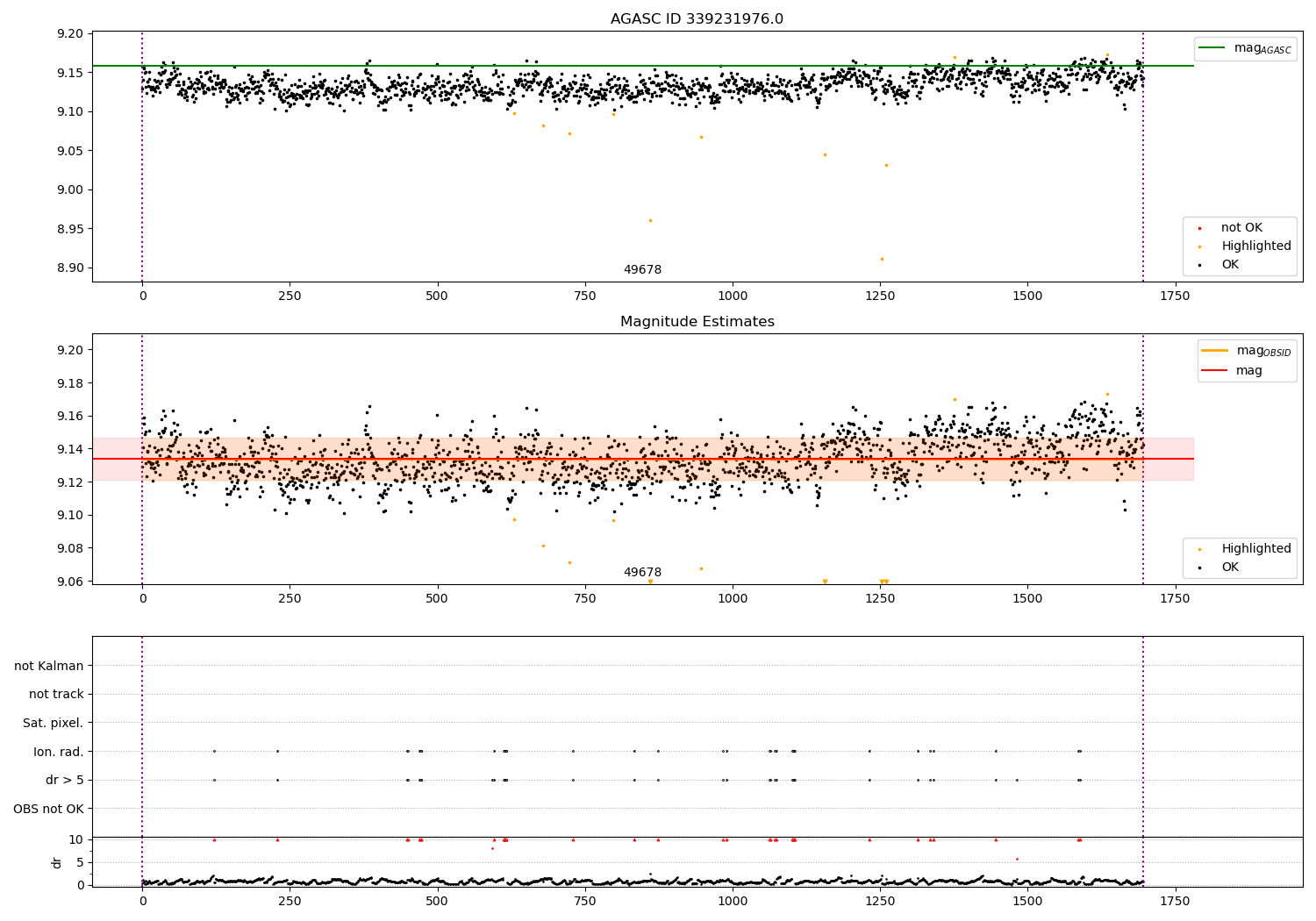 | OBSID | Time | Row | Col | N | Nok | Nout | ftrack | fdr3 | fdr5 | fok | ⟨ δ mag ⟩ 100s | ⟨ mag ⟩ | σmag | Comments |