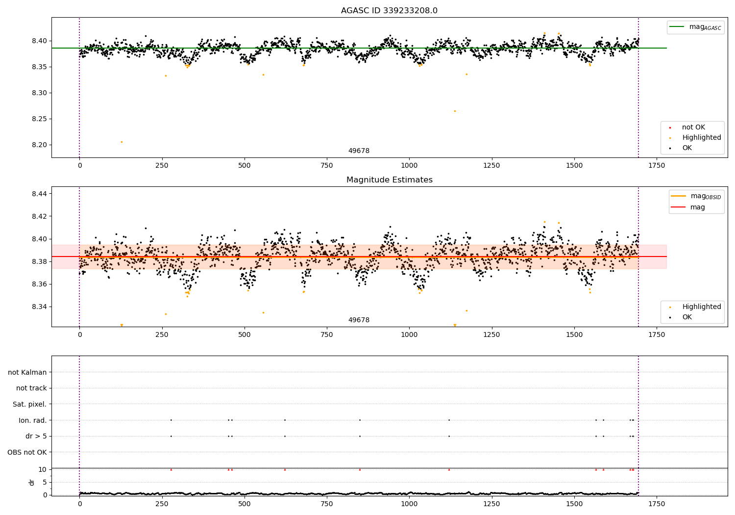 | OBSID | Time | Row | Col | N | Nok | Nout | ftrack | fdr3 | fdr5 | fok | ⟨ δ mag ⟩ 100s | ⟨ mag ⟩ | σmag | Comments |