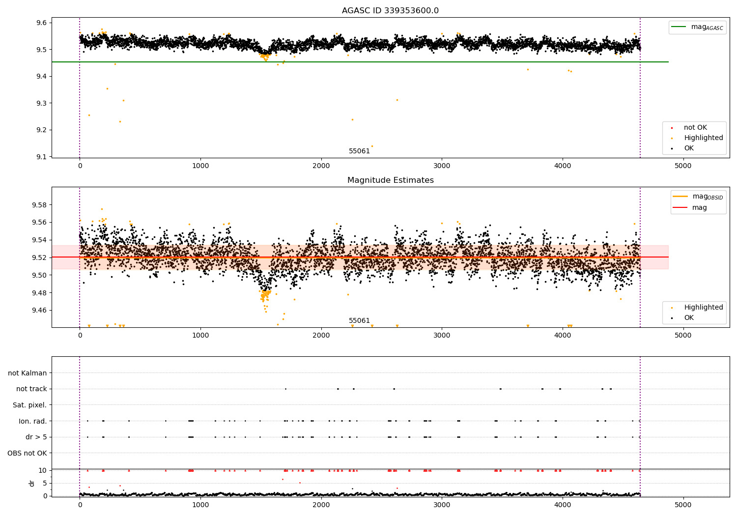 | OBSID | Time | Row | Col | N | Nok | Nout | ftrack | fdr3 | fdr5 | fok | ⟨ δ mag ⟩ 100s | ⟨ mag ⟩ | σmag | Comments |