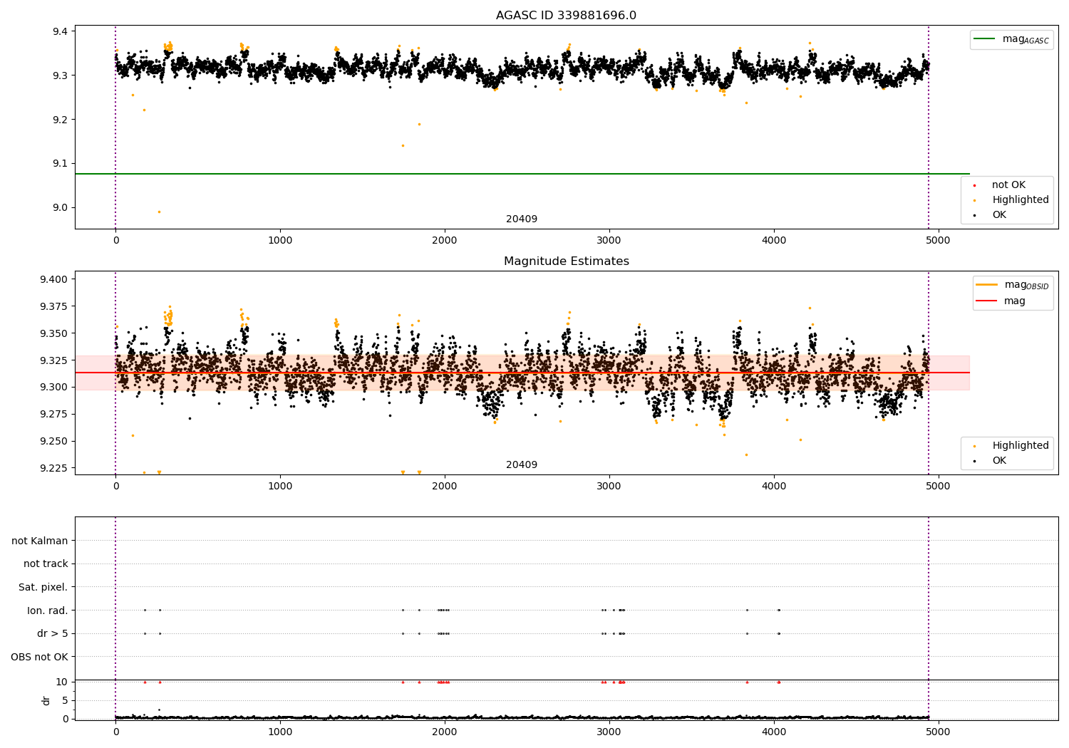 | OBSID | Time | Row | Col | N | Nok | Nout | ftrack | fdr3 | fdr5 | fok | ⟨ δ mag ⟩ 100s | ⟨ mag ⟩ | σmag | Comments |